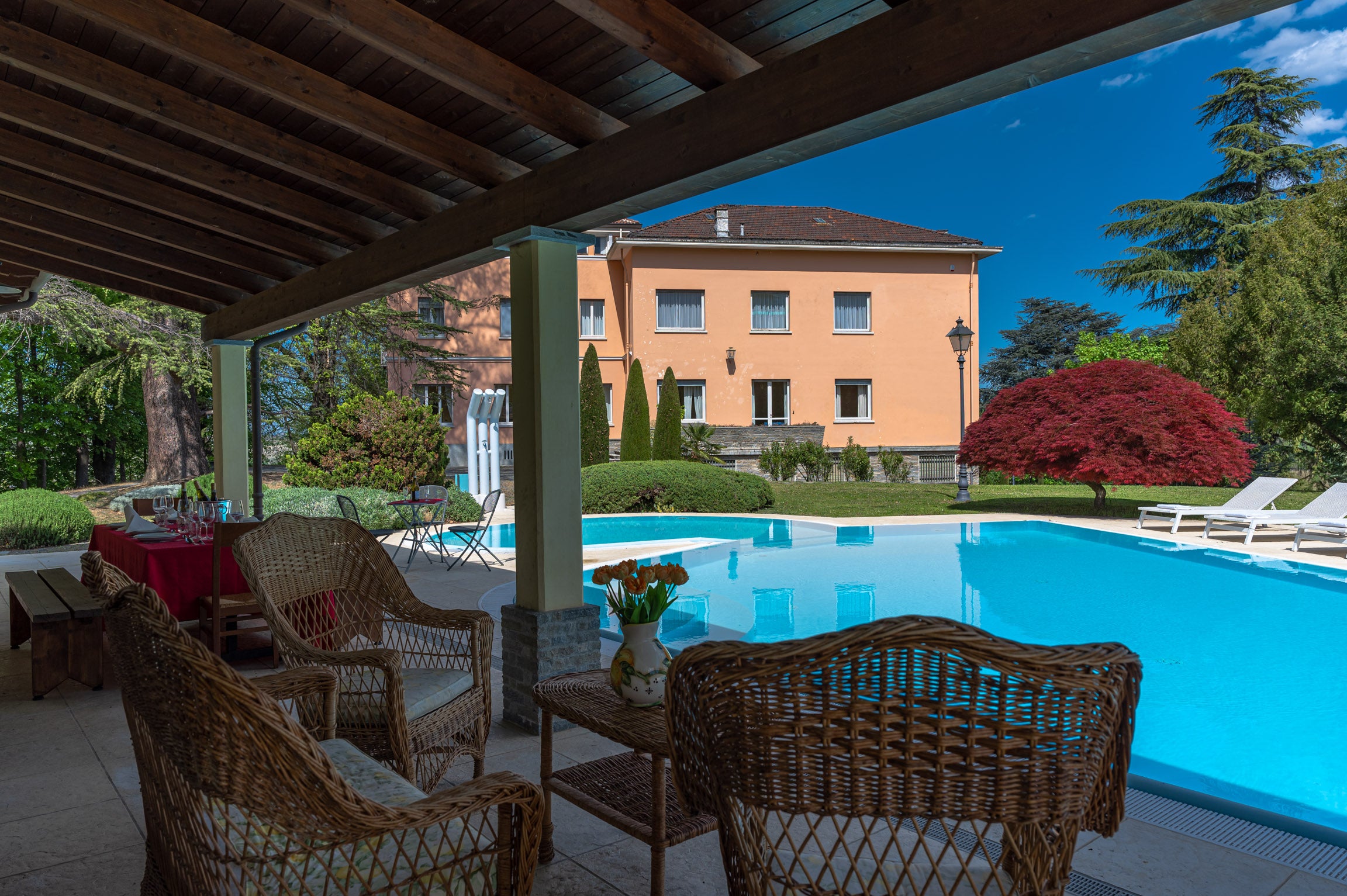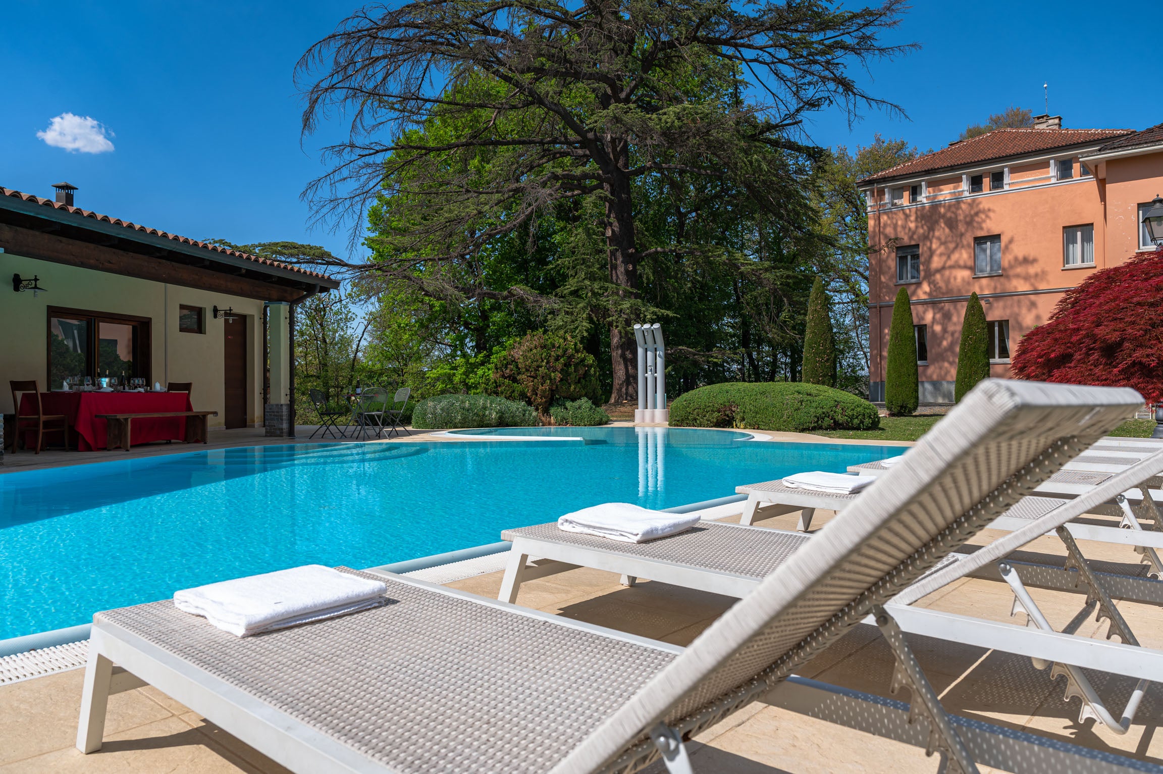 All'esterno la villa è circondata da un parco secolare, con vialetti, panchine, piscina con idromassaggio, doccia solare, docce interne, spogliatoi, un patio e una pool-house con punto ristoro.