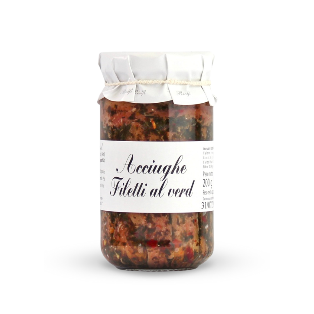 Zutaten: Sardellenfilets 56 % ( Engraulis Encrasicolus ), Olivenöl, Petersilie 2 %, Knoblauch, Chilischote, Meersalz, Weinessig.
