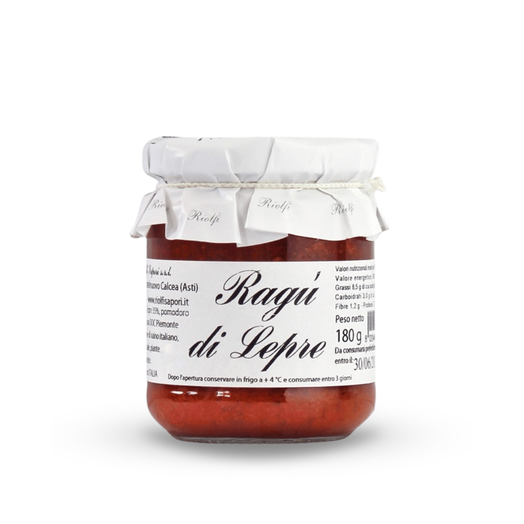 Ingredients: Hare meat 35%, Italian tomatoes 25%, Piemonte Barbera red wine, onions, italian pork, extra virgin olive oil, salt, aromatic herbs, garlic, spices.