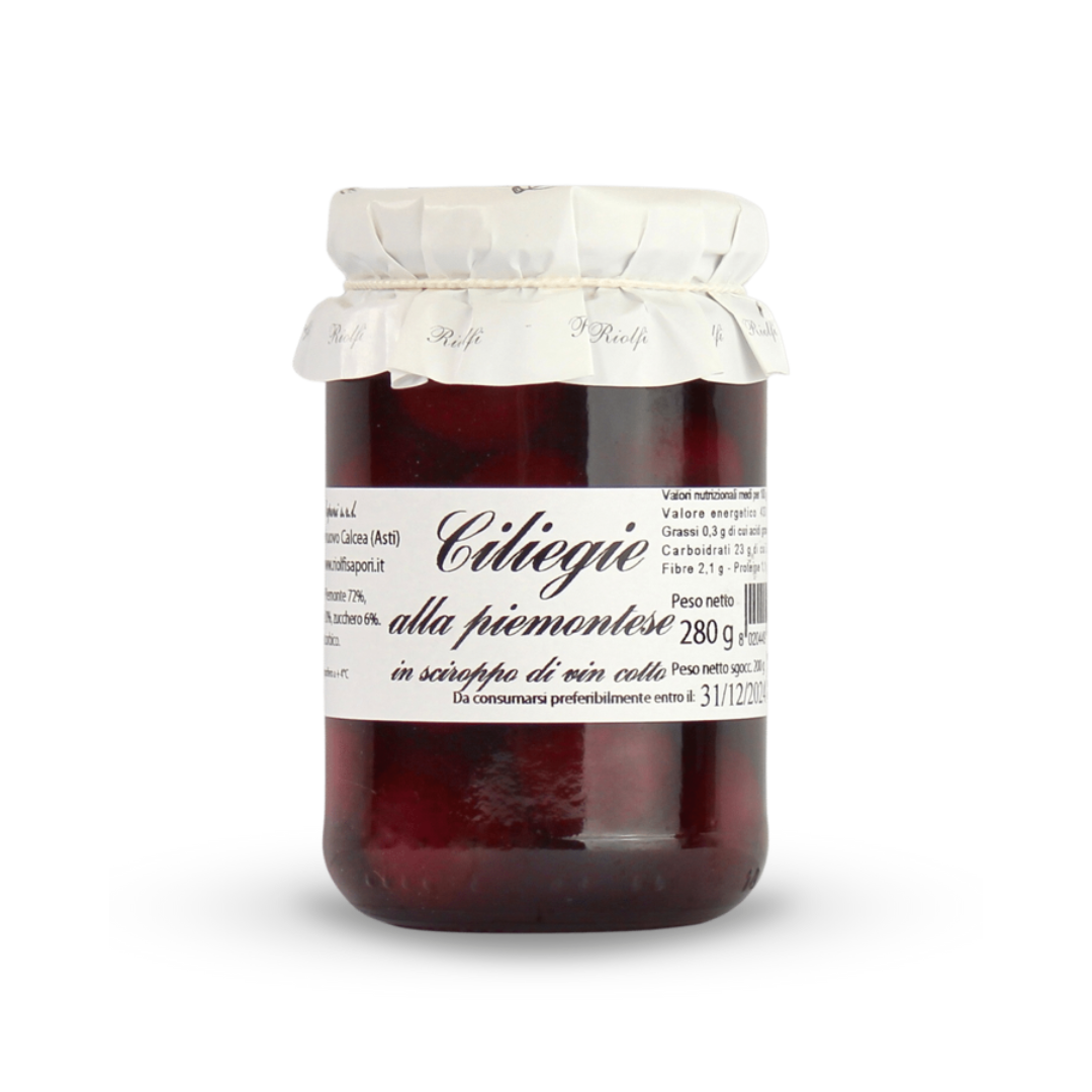 Les cerises du Piémont cueillies à la main et immergées dans le délicieux "vin cotto", un sirop sans alcool préparé avec du vin rouge, unique en son genre, sont parfaites en dessert ou avec de la glace.