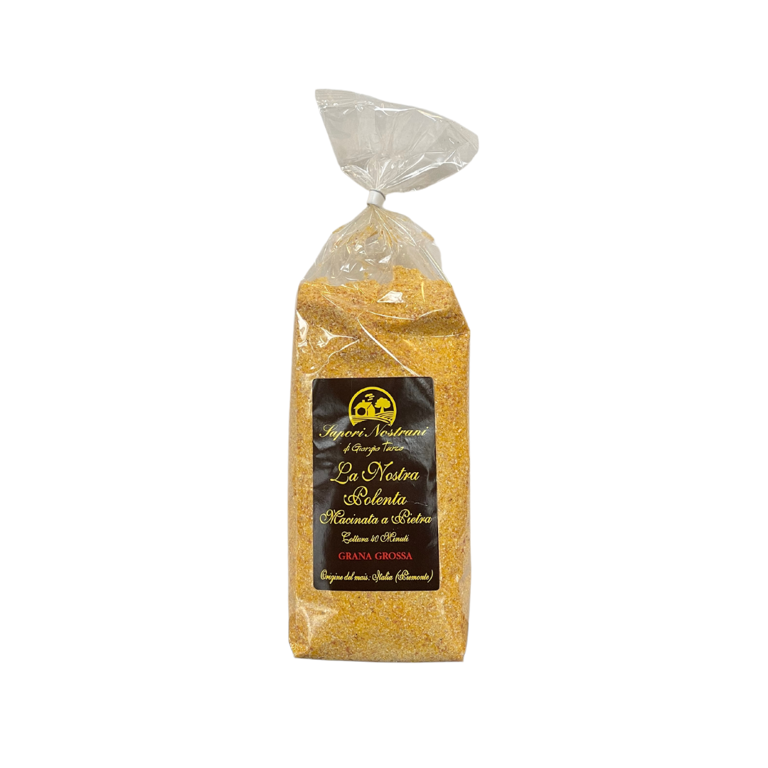 Farina per polenta a grana grossa, macinata a pietra. Il mais viene coltivato nei campi di Dusino San Michele (Asti - Piemonte). Può contenere tracce di glutine, frutta a guscio, molluschi, soia e sedano.