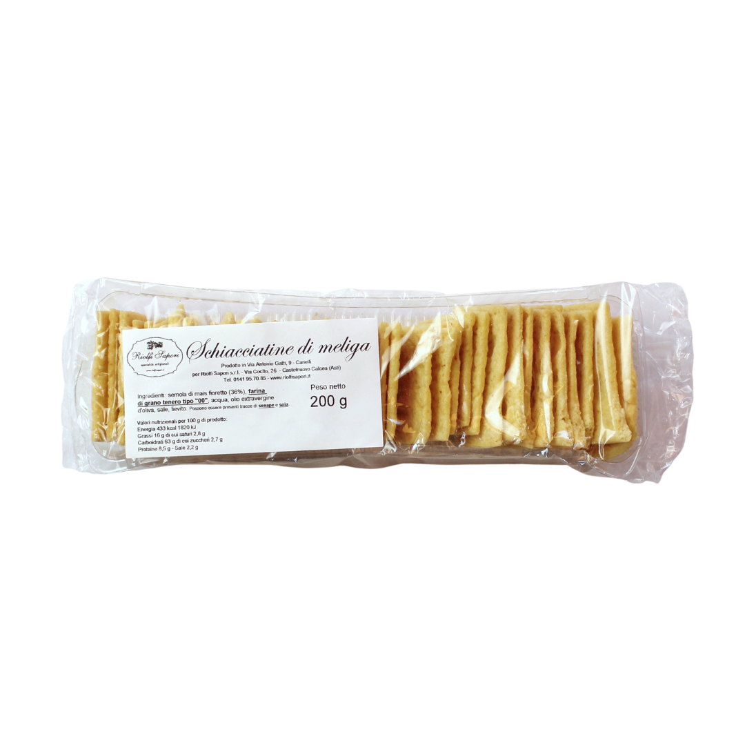 Ingredienti: semola di mais fioretto (36%), farina di grano tenero tipo “00”, acqua, olio extravergine d’oliva, sale, lievito. Possono essere presenti tracce di senape e soia.